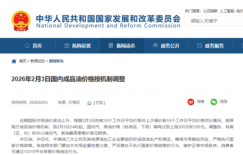 近期国际市场油价波动上升,根据2月3日的前10个工作日平均价格与上次调价前10个工作日平均价格对比情况,按照现行成品油价格机制,自2月3日24时起,国内汽、柴油价格(标准品,下同)每吨分别上涨205元和195元。全国平均来看:92号汽油、95号汽油、0号柴油每升分别上调0.16元、0.17元、0.17元。用92号汽油加满50升油箱将多花8元。调整后,各省(区、市)和中心城市汽、柴油最高零售价格见附表。