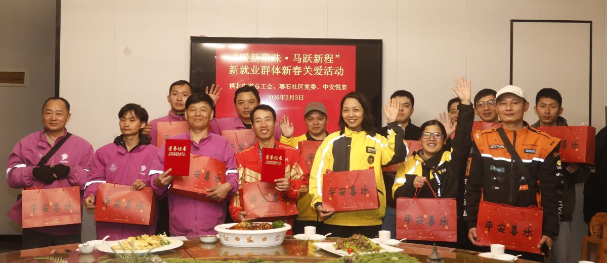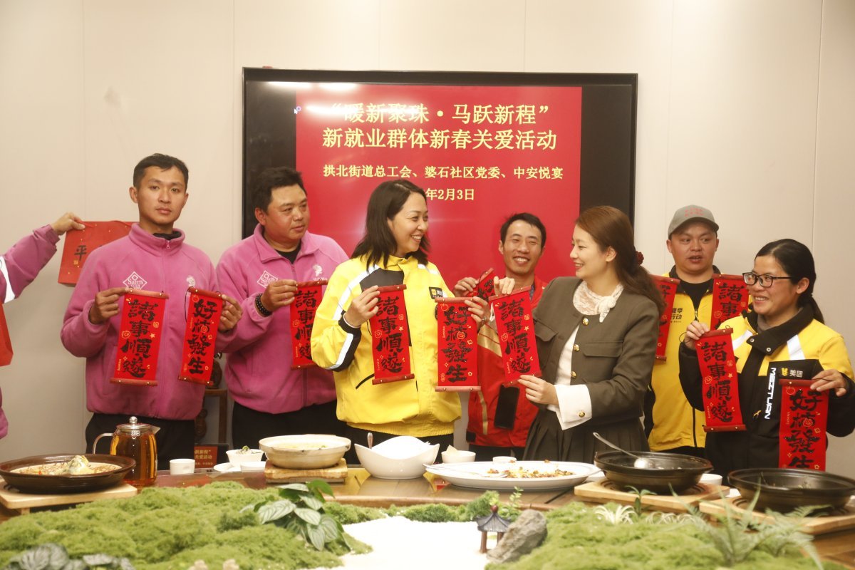 2月3日晚,拱北街道婆石社区联合拱北街道总工会、中安悦宴餐厅,在辖区中安悦宴餐厅开展“暖新聚珠·马跃新程”新就业群体暖心家宴主题活动,二十余名快递员、外卖骑手、网约车司机等新就业形态劳动者代表欢聚一堂,在热气腾腾的团圆饭中共迎新春,感受社区关怀。