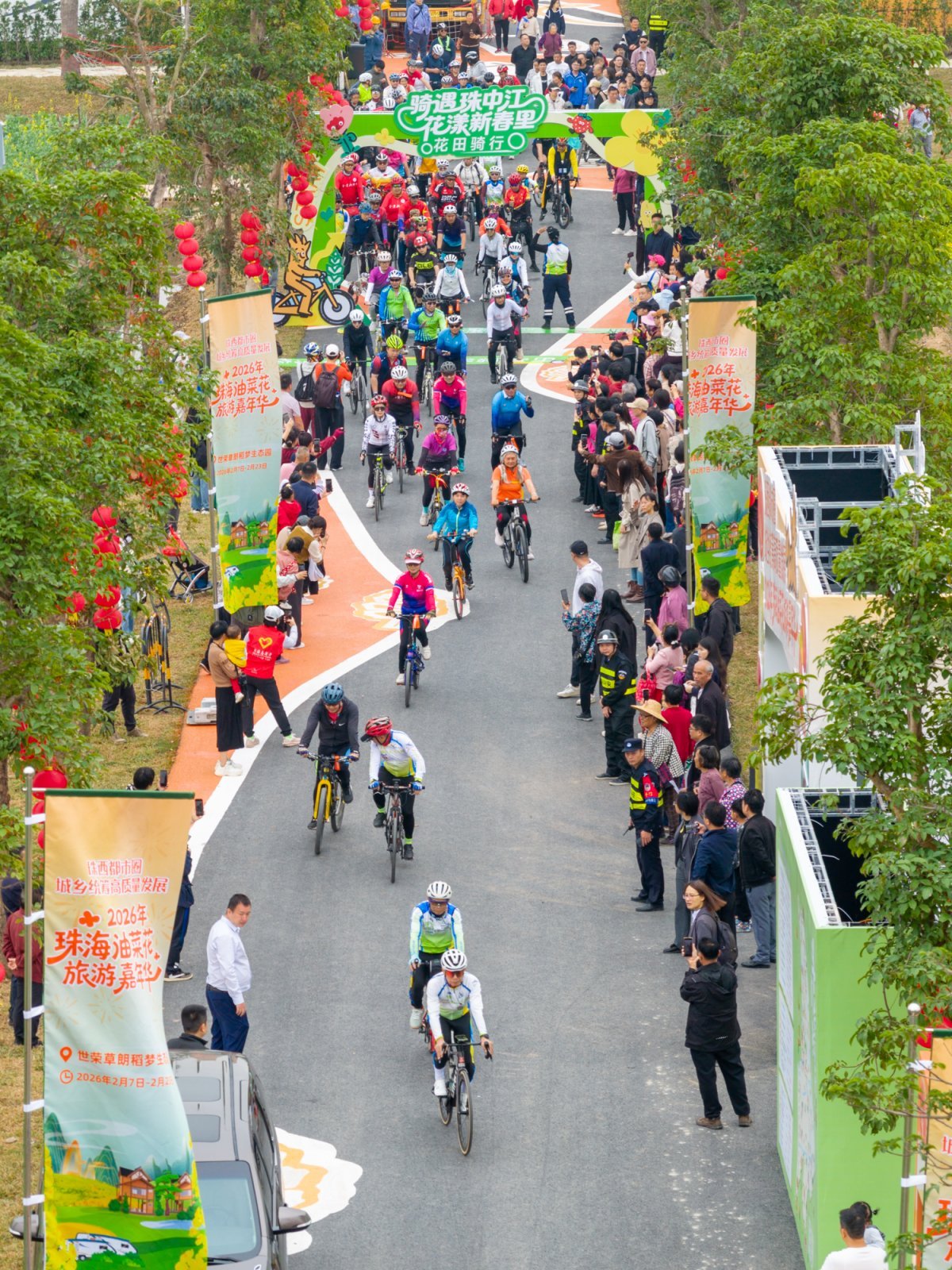 在“百千万工程”的引领下,珠海正切实扛起推动珠西高质量发展的“头雁”责任,奏响都市圈“破壁”融合协奏曲。开幕式上,珠中江温泉旅游推广联盟合作签约与斗门区打造珠中江都市大花园农文旅融合项目签约同步进行,涵盖主题酒店、休闲乐园、历史街区活化、跨城旅游环线等多个领域。这批项目的集中落地,体现了珠西都市圈文旅产业从“单点发力”迈向“系统协作”,以资源互通、产品共推、市场共享为核心的区域协同发展格局正在加速形成。现场为“珠中江花田骑行” 鸣笛发令,邀请三地骑行爱好者共游田园风景线。