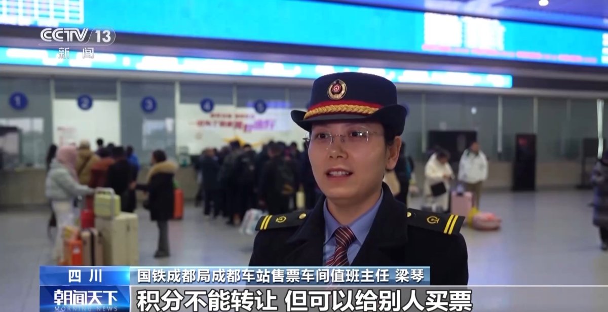 国铁成都局成都车站售票车间值班主任梁琴:积分不能转让,但可以给别人买票,每名会员最多可设置8名受让人,受让人须通过身份信息核验,且添加成功60日(含当日)后才能生效。