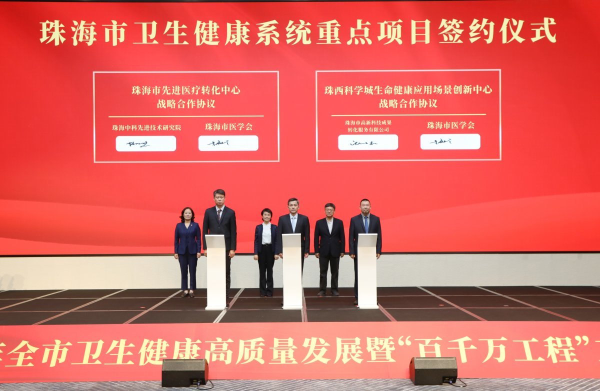 在今天下午召开的2026年全市卫生健康高质量发展暨“百千万工程”工作会议上,在市领导及市卫生健康局、高新区等相关部门见证下,珠海市医学会与珠海中科先进技术研究院、珠海市高新科技成果转化服务有限公司现场签署战略合作协议,同时会上还宣布将实施加强医产研融合高质量发展行动,政企医三方联动打通临床与产业转化壁垒,为我市生物医药与大健康产业发展注入新动能。