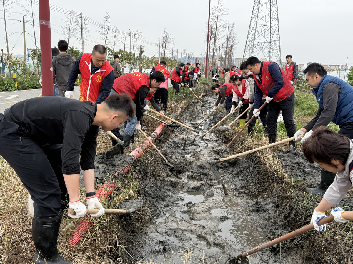 当天下午,金湾区红旗镇清淤现场党旗飘扬、热潮涌动。人工清淤队伍分组有序进入作业区,党员干部带头挥锹铲淤,志愿者与村民群众分工协作,对300米农田灌排沟渠开展人工清淤疏浚;专业队伍调配2台机械设备,同步对约1000米农田灌排沟渠开展高效作业。本次集中活动,全市各行动点累计清理沟渠2700米,清理淤泥及杂草约900立方米。