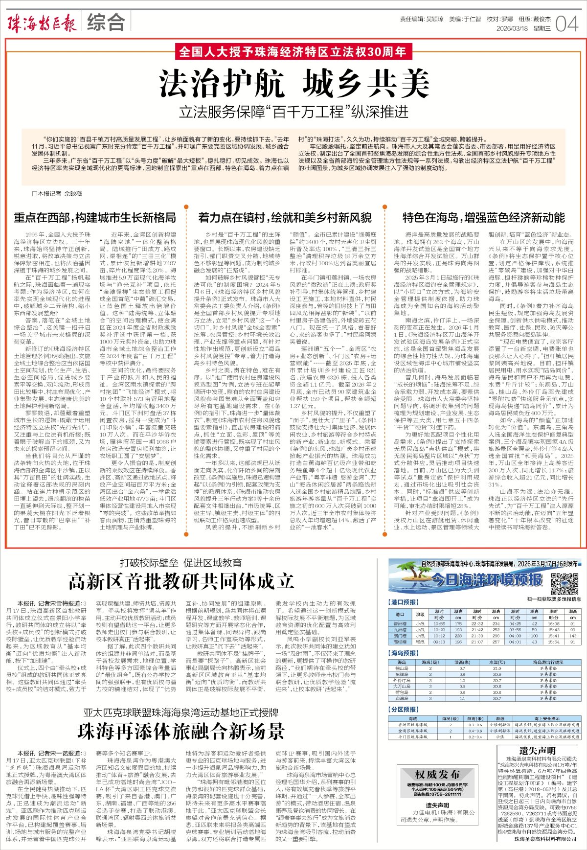 牢记殷殷嘱托,坚定前进航向。珠海市人大及其常委会落实省委、市委部署,用足用好经济特区立法权,制定出台了全国首部聚焦海岛发展的综合性地方性法规、全国首部乡村风貌提升专项地方性法规以及全省首部海钓安全管理地方性法规等一系列法规,勾勒出经济特区立法护航“百千万工程”的壮阔图景,为城乡区域协调发展注入了强劲的制度动能。