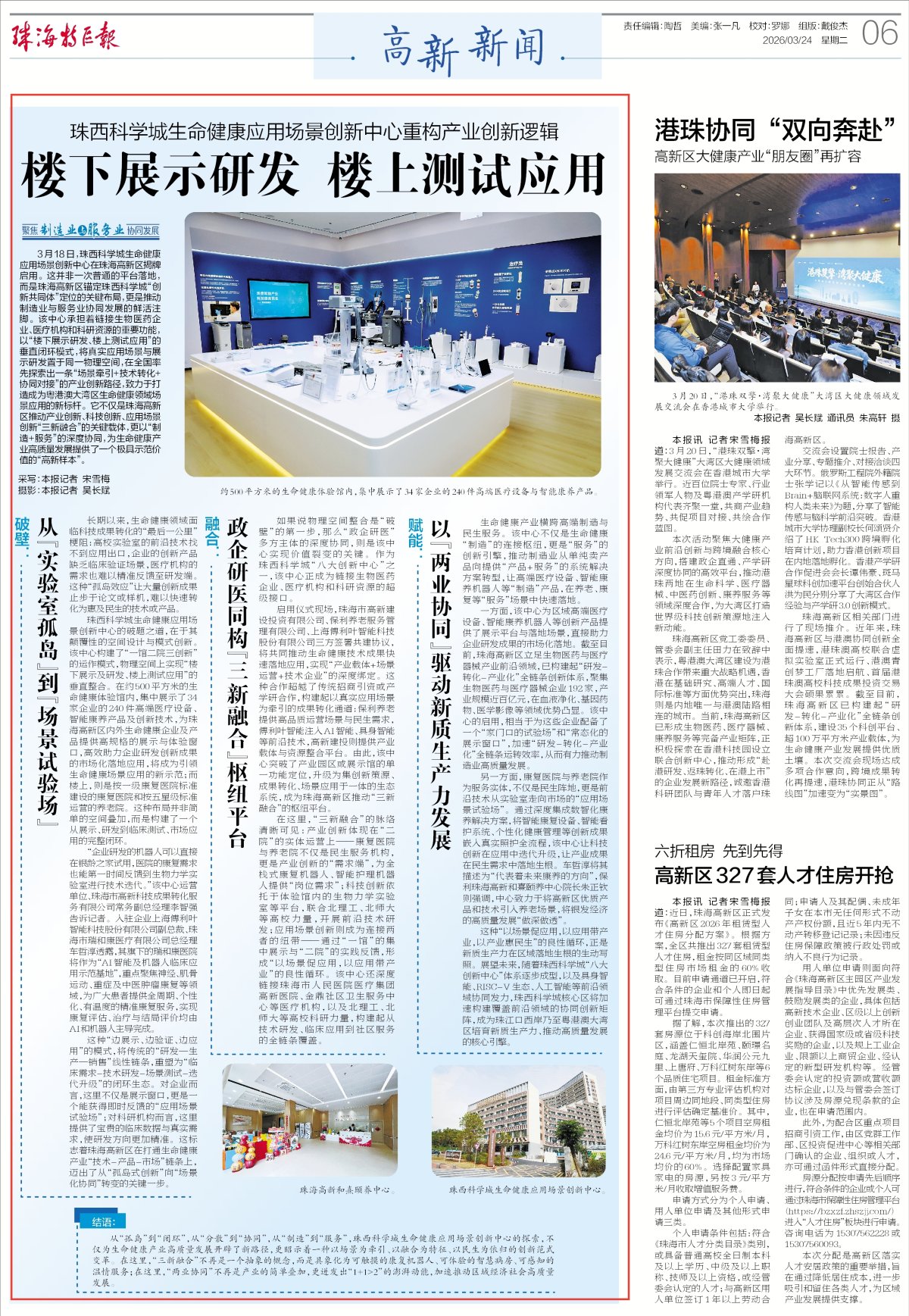 3月18日,珠西科学城生命健康应用场景创新中心在珠海高新区揭牌启用。这并非一次普通的平台落地,而是珠海高新区锚定珠西科学城“创新共同体”定位的关键布局,更是推动制造业与服务业协同发展的鲜活注脚。该中心承担着链接生物医药企业、医疗机构和科研资源的重要功能,以“楼下展示研发、楼上测试应用”的垂直闭环模式,将真实应用场景与展示研发置于同一物理空间,在全国率先探索出一条“场景牵引+技术转化+协同对接”的产业创新路径,致力于打造成为粤港澳大湾区生命健康领域场景应用的新标杆。它不仅是珠海高新区推动产业创新、科技创新、应用场景创新“三新融合”的关键载体,更以“制造+服务”的深度协同,为生命健康产业高质量发展提供了一个具有示范价值的“高新样本”。