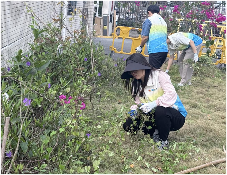 活动现场,志愿者们在绿化带、草坪及边角空地,徒手或使用手持除草机、锄头、剪刀等工具,对杂草、枯枝、藤蔓等进行集中清理。他们有的弯腰拔除杂草,有的负责收集清运杂物,使原本杂乱的绿化带逐渐变得整齐清爽。