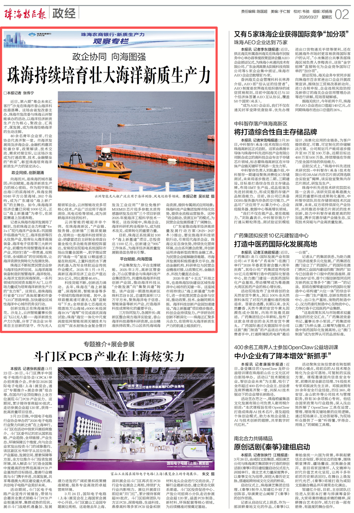 《广东省推动海洋经济高质量发展行动方案(2025-2027年)》提出,要实施海洋科技领航行动,引育现代海洋企业。珠海立足自身优势,持续优化营商环境,出台系列惠企政策,并创新运用涉海新型政策性金融工具,为民营企业破解融资难题。市海洋发展局积极搭建多方平台,推动金融机构、科研单位与民营企业精准对接,让政策红利、金融活水、科技力量直达企业。