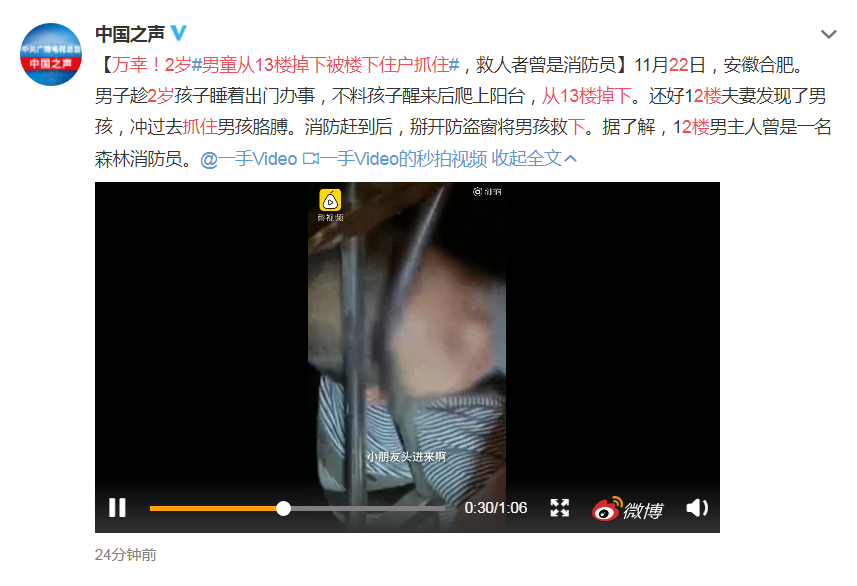 11月22日,安徽合肥。男子趁2岁孩子睡着出门办事,不料孩子醒来后爬上阳台,从13楼掉下。还好12楼夫妻发现了男孩,冲过去抓住男孩胳膊。消防赶到后,掰开防盗窗将男孩救下。据了解,12楼男主人曾是一名森林消防员。