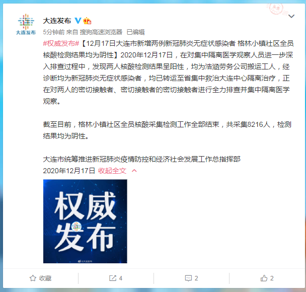2020年12月17日,在对集中隔离医学观察人员进一步深入排查过程中,发现两人核酸检测结果呈阳性,均为浩涵劳务公司搬运工人,经诊断均为新冠肺炎无症状感染者,均已转运至省集中救治大连中心隔离治疗,正在对两人的密切接触者、密切接触者的密切接触者进行全力排查并集中隔离医学观察。