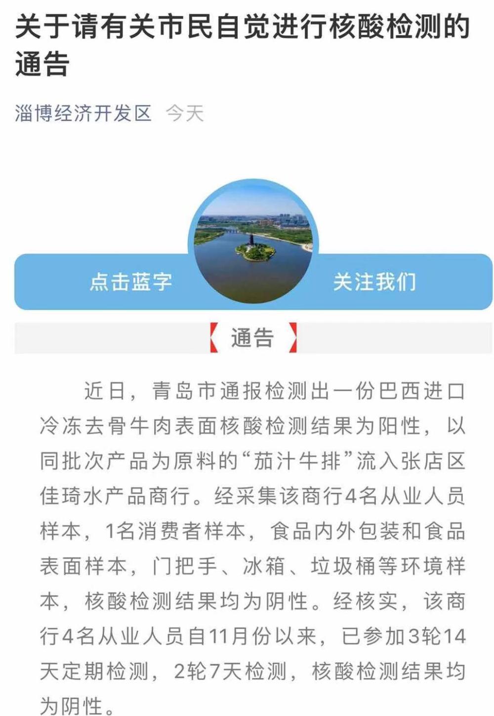 为确保广大人民群众的身体健康,根据《淄博市新冠病毒核酸阳性食品应急处置方案》、《淄博市不明来源新型冠状病毒肺炎病例应急处置方案》的规定,请2020年11月26日至12月29日到“张店区佳琦水产品商行”(王舍路178号山东博发农副产品综合批发市场内)购买茄汁牛排的市民及其家人第一时间主动向淄博经济开发区冷链食品疫情防控工作专班(联系电话:7013906)登记报备,同时做好自我健康观察。报备后,淄博经济开发区将及时组织进行核酸检测。