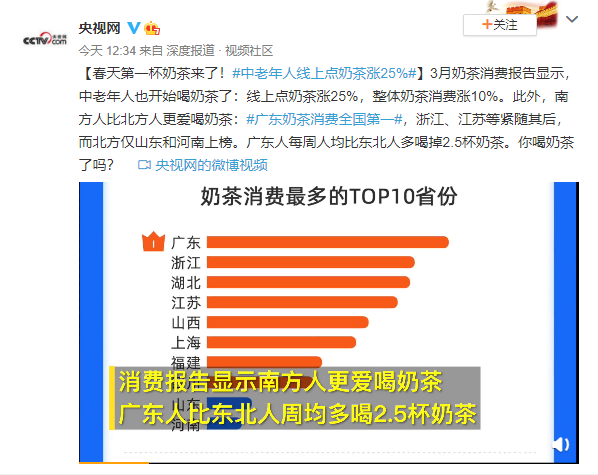3月奶茶消费报告显示,中老年人也开始喝奶茶了:线上点奶茶涨25%,整体奶茶消费涨10%。此外,南方人比北方人更爱喝奶茶:广东奶茶消费全国第一,浙江、江苏等紧随其后,而北方仅山东和河南上榜。广东人每周人均比东北人多喝掉2.5杯奶茶。这个春天的第一杯奶茶,你喝到了吗?