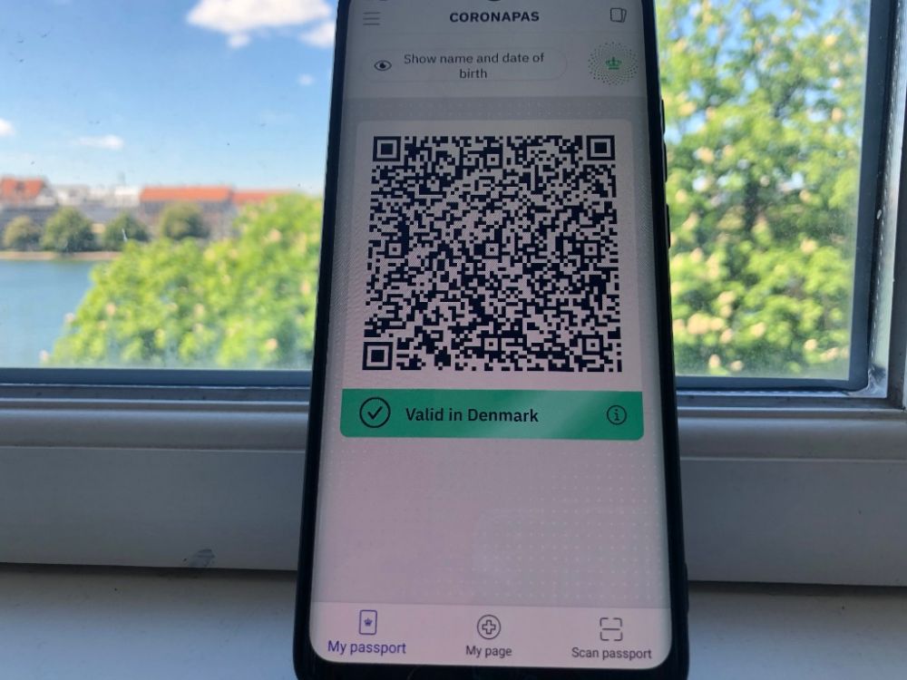 这是5月28日在丹麦哥本哈根拍摄的手机上以二维码形式呈现的“新冠通行证”。(新华社发,于珂摄)