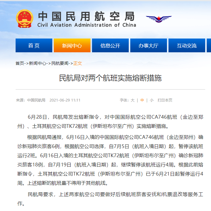 6月28日,民航局发出熔断指令,对中国国际航空公司CA746航班(金边至郑州)、土耳其航空公司TK72航班(伊斯坦布尔至广州)实施熔断措施。