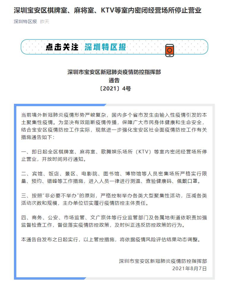 一、即日起全区棋牌室、麻将室、歌舞娱乐场所(KTV)等室内密闭经营场所停止营业,开放时间另行通知。