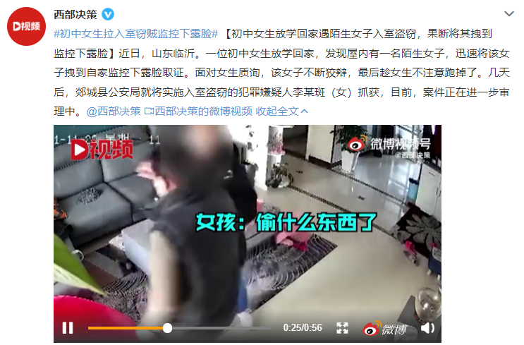 近日,山东临沂。一位初中女生放学回家,发现屋内有一名陌生女子,迅速将该女子拽到自家监控下露脸取证。面对女生质询,该女子不断狡辩,最后趁女生不注意跑掉了。几天后,郯城县公安局就将实施入室盗窃的犯罪嫌疑人李某斑(女)抓获,目前,案件正在进一步审理中。