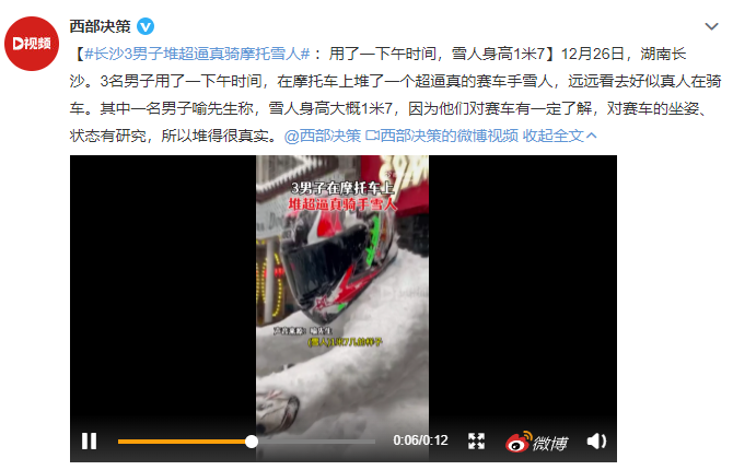 12月26日,湖南长沙。3名男子用了一下午时间,在摩托车上堆了一个超逼真的赛车手雪人,远远看去好似真人在骑车。其中一名男子喻先生称,雪人身高大概1米7,因为他们对赛车有一定了解,对赛车的坐姿、状态有研究,所以堆得很真实。