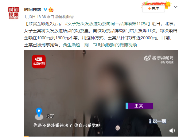 近日,北京。女子王某将头发放进所点的奶茶里,向该奶茶品牌8家门店共投诉11次,每次索赔金额在1000元到1500元不等。用这种方式,王某共计“获赔”近20000元。目前,王某已被刑事拘留。