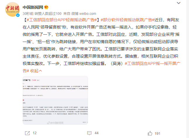 部分软件轻微摇动就跳广告。近日,有网友在人民网“领导留言板”称,有些软件开屏广告还有摇一摇进入,如果你手机没拿稳,轻微的摇晃了一下,它就会进入开屏广告。工信部对此回应,近期,发现部分企业采用“摇一摇”“扭一扭”作为跳转链接,用户在非知情自愿的情况下,仅轻微摇动或扭动即误导用户触发页面跳转,给广大用户带来了困扰。工信部已要求涉及的主要互联网企业落实主体责任,优化参数设置,合理设置开屏信息跳转方式。据抽查,相关互联网企业已积极落实整改。下一步,工信部将继续加强监督。