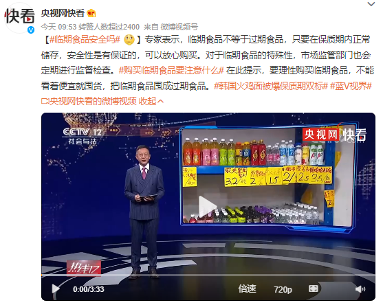 专家表示,临期食品不等于过期食品,只要在保质期内正常储存,安全性是有保证的,可以放心购买。对于临期食品的特殊性,市场监管部门也会定期进行监督检查。在此提示,要理性购买临期食品,不能看着便宜就囤货,把临期食品囤成过期食品。