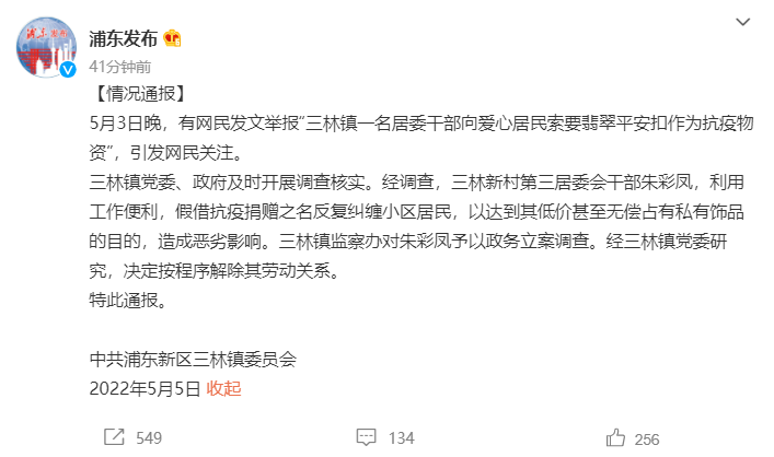 5月3日晚,有网民发文举报“(上海市浦东新区)三林镇一名居委干部向爱心居民索要翡翠平安扣作为抗疫物资”,引发网民关注。