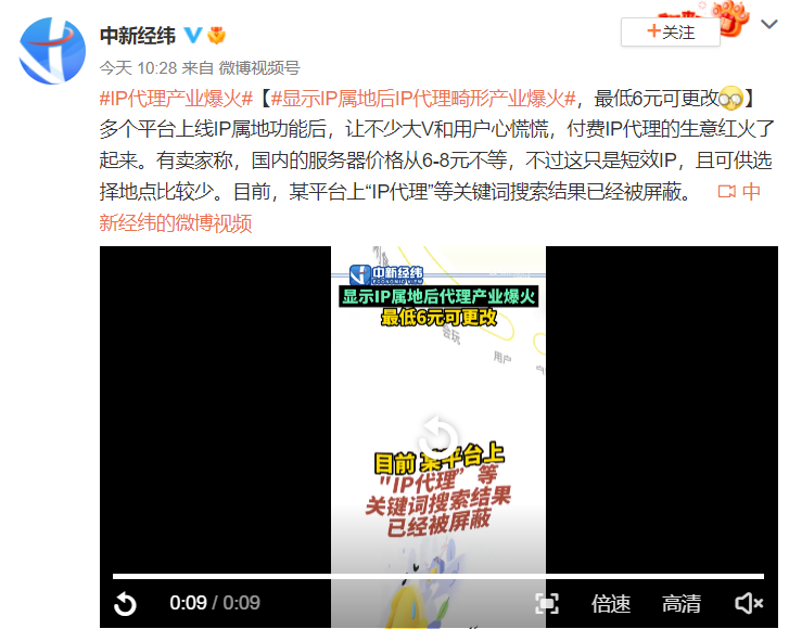 多个平台上线IP属地功能后,让不少大V和用户心慌慌,付费IP代理的生意红火了起来。有卖家称,国内的服务器价格从6-8元不等,不过这只是短效IP,且可供选择地点比较少。目前,某平台上“IP代理”等关键词搜索结果已经被屏蔽。