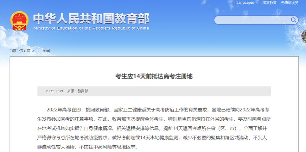 2022年高考在即,按照教育部、国家卫生健康委关于高考防疫工作的有关要求,各地已陆续向2022年高考考生发布参加高考的注意事项。在此,教育部再次提醒全体考生,特别是当前仍滞留在外省的考生,要及时向考点所在地考试机构如实报告自身健康情况、相关返程安排等信息,提前14天返回考点所在省(区、市),全面了解并严格遵守考点所在地考试防疫要求,做好考前连续14天本地健康监测,减少不必要的聚集和跨区域流动、不到人群流动性较大场所、不前往中高风险等级地区等。