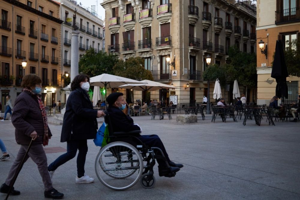 2021年10月25日,戴口罩的行人走过西班牙马德里市中心。新华社记者 孟鼎博 摄