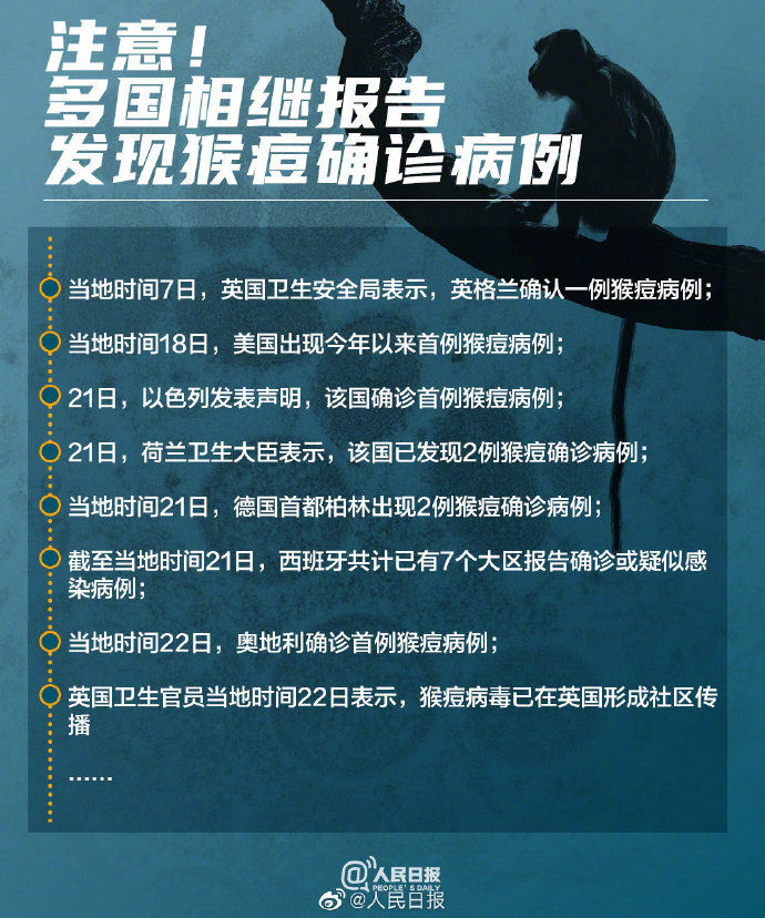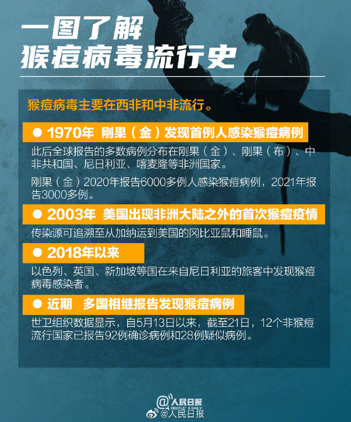 近期,多国相继报告发现猴痘确诊病例。什么是猴痘?①一种病毒性人畜共患病;②因一组用于研究的猴子中出现“痘状”传染病得名,于1958年首次发现;③具有自限性,多数猴痘感染者会在几周内康复。猴痘病毒如何传播?临床症状是什么?如何预防?