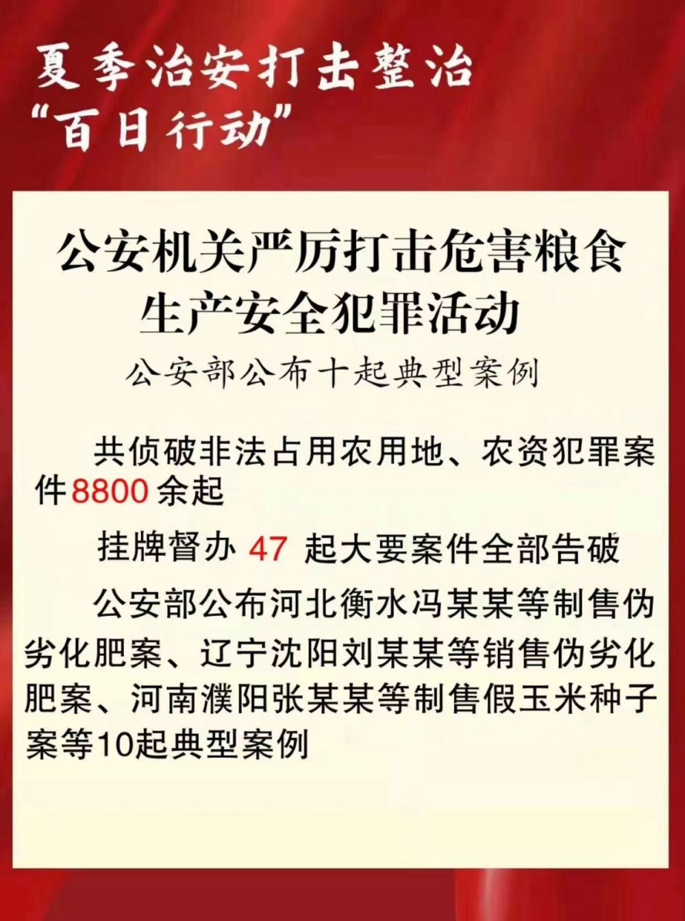 记者8月2日从公安部获悉,全国公安机关紧密结合夏季治安打击整治“百日行动”,持续深入开展“昆仑”系列专项行动,依法严厉打击制售假劣农资、非法占用耕地等危害粮食生产安全的犯罪活动。去年1月以来,公安机关共侦破非法占用农用地、农资犯罪案件8800余起,公安部挂牌督办47起大要案件全部告破。