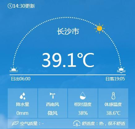 此外,今天14时30分,湖南长沙的实时气温已经达到39.1℃,据中国天气网气象分析师王伟跃介绍,如果今天长沙的气温超过39.2℃,那么将打破最高气温的历史纪录。