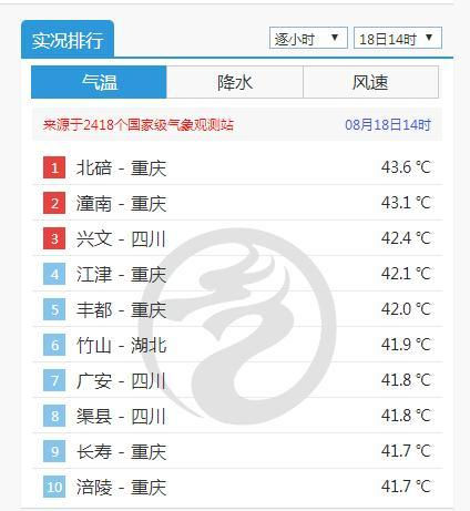 今天,南方大部地区依然是热到炸的一天!截至下午14时,全国有264个高温红色预警信号正在生效,并且这一时段全国气温排行榜前十名的“门槛”已经提升至41℃,霸榜的依然是重庆、四川这两位“好兄弟”,其中重庆北碚依然以43.6℃的气温继续占据全国气温排行榜这一时段的榜首位置。