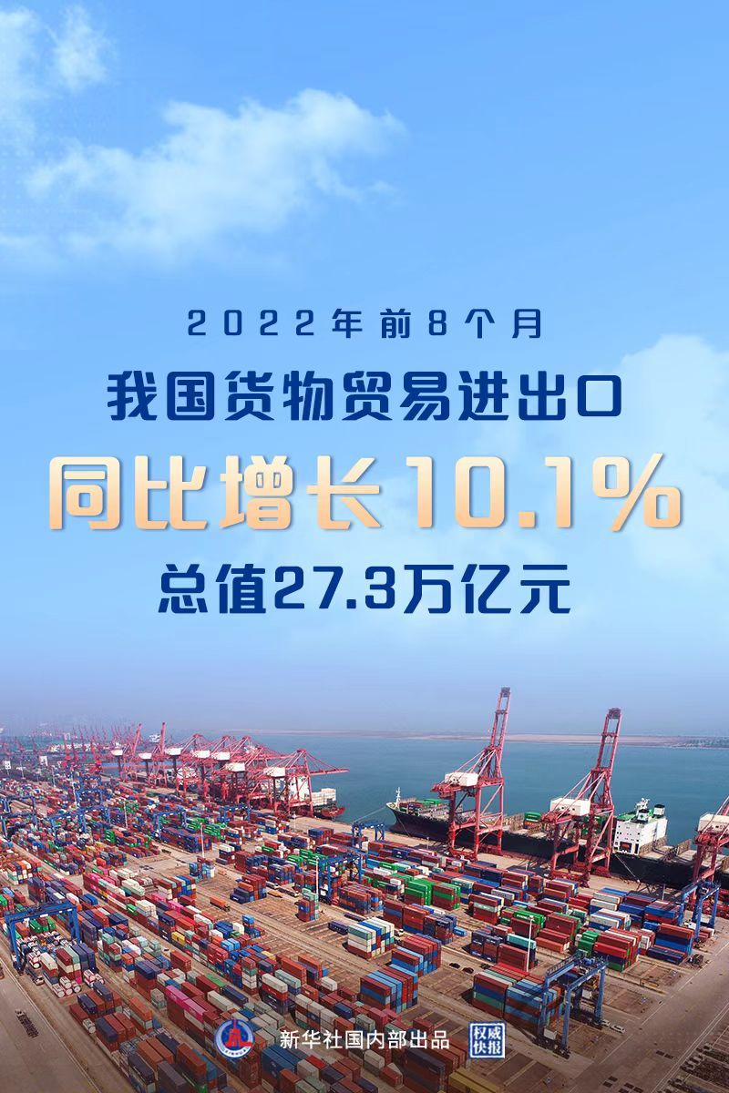 海关总署7日发布数据显示2022年前8个月我国货物贸易进出口总值27.3万亿元同比增长10.1%海关总署统计分析司司长李魁文表示今年以来面对复杂严峻的外贸发展环境我国高效统筹疫情防控和经济社会发展持续出台稳外贸系列政策推动外贸实现稳定增长其中前8个月广东、江苏、浙江、上海北京、山东、福建等7个省市对全国外贸增长的贡献率超过七成为稳定外贸大盘提供了关键支撑