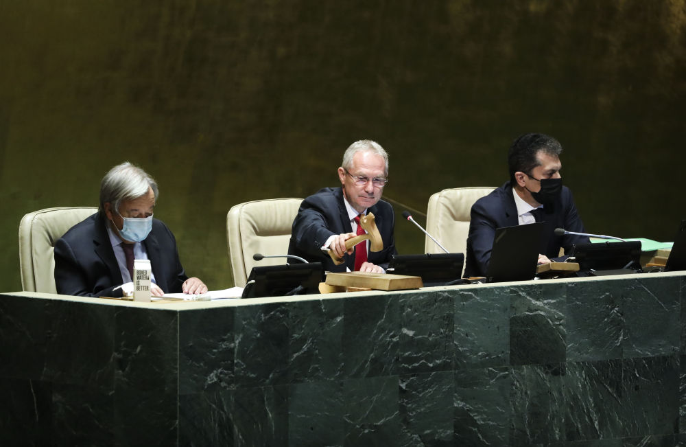 第76届联大12日举行闭幕会。第76届联大主席沙希德致辞,克勒希宣誓就任第77届联大主席。