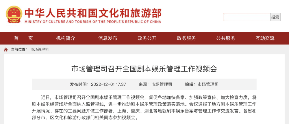 近日,文化和旅游部市场管理司召开全国剧本娱乐管理工作视频会,督促各地加快备案、加强政策宣传、加大检查力度,将剧本娱乐经营场所全面纳入监管视线,进一步推动剧本娱乐管理政策落实落地。会议通报了地方剧本娱乐管理工作开展情况、存在的主要问题并做工作部署。
