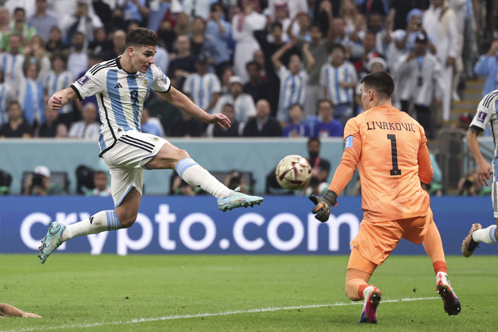 阿根廷队第39分钟发动反击,阿尔瓦雷斯从本方半场得球后带球突入对方禁区,虽然克罗地亚队球员在禁区内阻断了他的带球,但皮球又弹回他的脚下,阿尔瓦雷斯随即将比分扩大为2:0。上半场伤停补时,克罗地亚队有机会扳回一球,尤拉诺维奇的传中打在防守球员身上弹向球门,阿根廷队门将马丁内斯飞身化解险情。