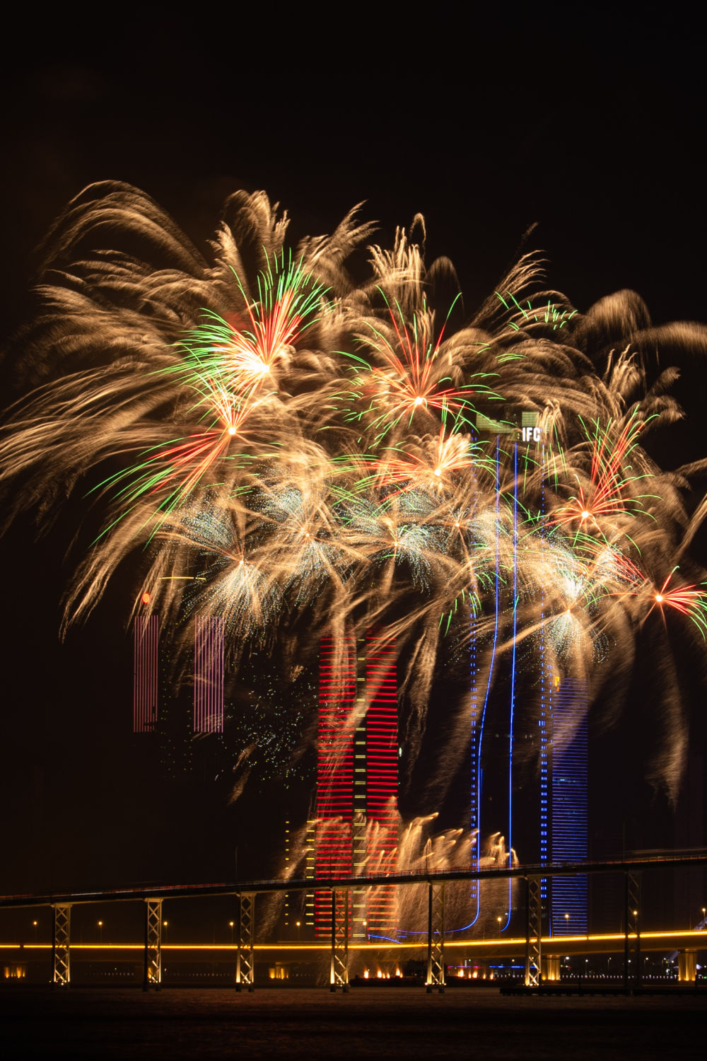 晚上9时45分,花车的喧天锣鼓声还未散去,朵朵绚烂的烟花已经绽放在海面上空。兔年首场“岁岁平安—绚丽澳门烟花汇演”接续送上,在旅游塔对出海面上演历时15分钟的璀璨烟花,将活动气氛推上高峰。