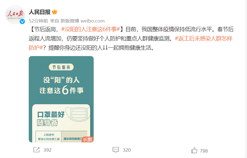 目前,我国整体疫情保持低流行水平。春节后返程人流增加,仍要坚持做好个人防护和重点人群健康监测。返工后未感染人群怎样防护?提醒你身边还没阳的人,一起拥抱健康生活。