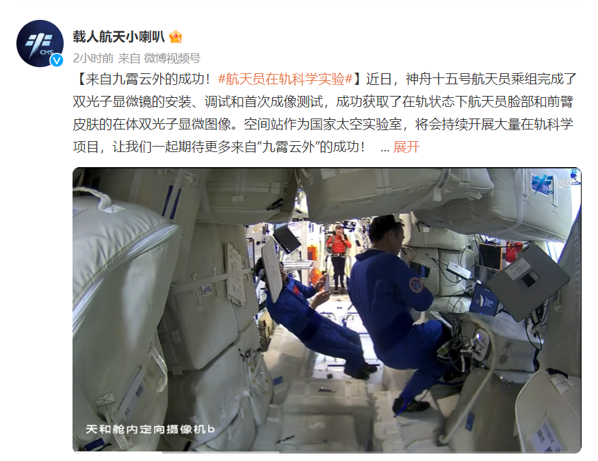 近日,神舟十五号航天员乘组完成了双光子显微镜的安装、调试和首次成像测试,成功获取了在轨状态下航天员脸部和前臂皮肤的在体双光子显微图像。空间站作为国家太空实验室,将会持续开展大量在轨科学项目,让我们一起期待更多来自“九霄云外”的成功!