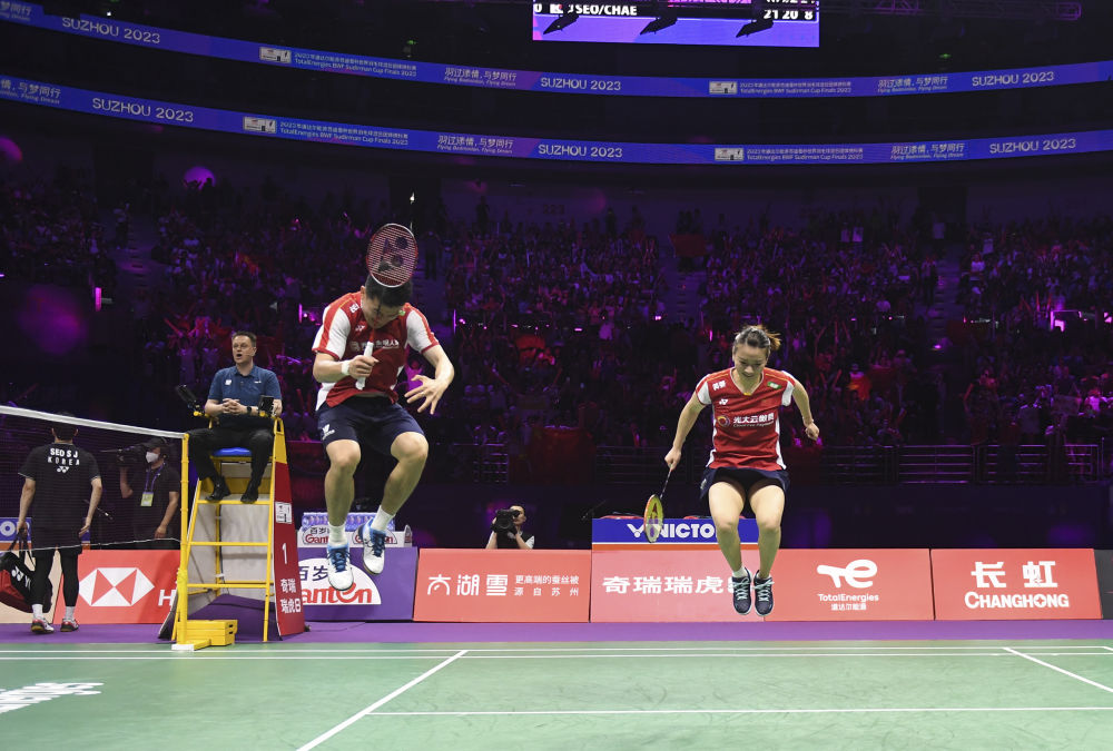 首场混双比赛,半决赛没有出场的世界第一郑思维/黄雅琼披挂上阵。面对世界第五的徐承宰/蔡侑玎,“雅思”组合以18:21先丢一局。第二局,郑思维/黄雅琼一度落后6分,不过他们连续追分,战至20平后,出现波动的对手连续接发球失误,“雅思”组合以22:20扳回一城。决胜局,势如破竹的中国组合以21:8轻松胜出。