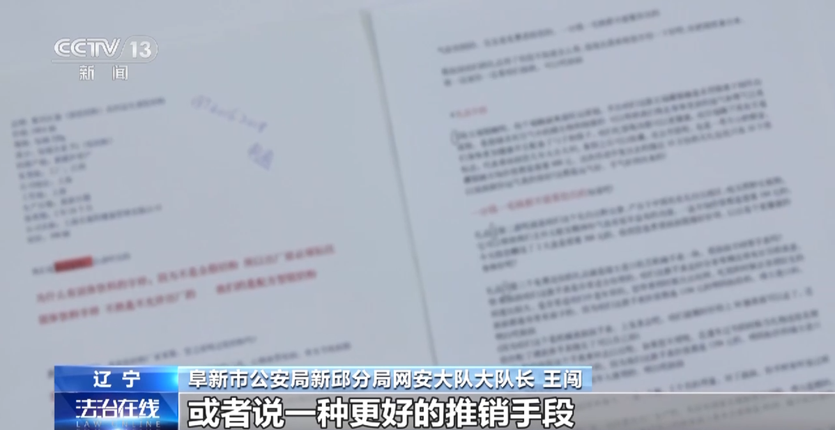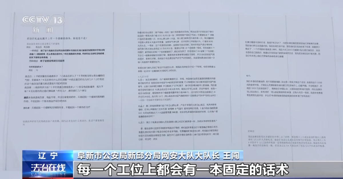 阜新市公安局新邱分局网安大队大队长王闯:每一个工位上都会有一本固定的话术,上面写得非常详细,比如说你高血压,我跟你该说些什么,你心脏不好,我该给你说些什么,用这些对应的话术,得到你的认可,向你出售这些驼奶粉,或者其他产品。