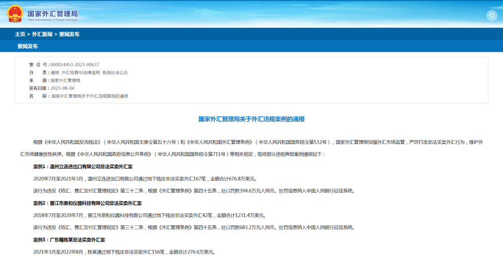 国家外汇管理局8月4日向社会通报了10起通过地下钱庄非法买卖外汇的案件,分别涉及2家企业和8名个人,案件罚款金额最高达683.2万元人民币。