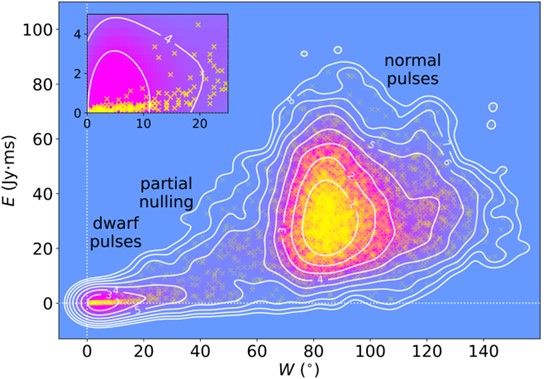 “矮脉冲在脉冲强度和宽度的分布上与正常脉冲明显区隔,构成一个独立的辐射族群。”韩金林说,正常辐射的脉冲看起来是脉冲星磁层中大量“雷暴”产生的大量带电粒子辐射出来的,而矮脉冲像是由濒临死亡的脉冲星在磁层中偶然形成的一个或少数几个粒子滴所辐射的。