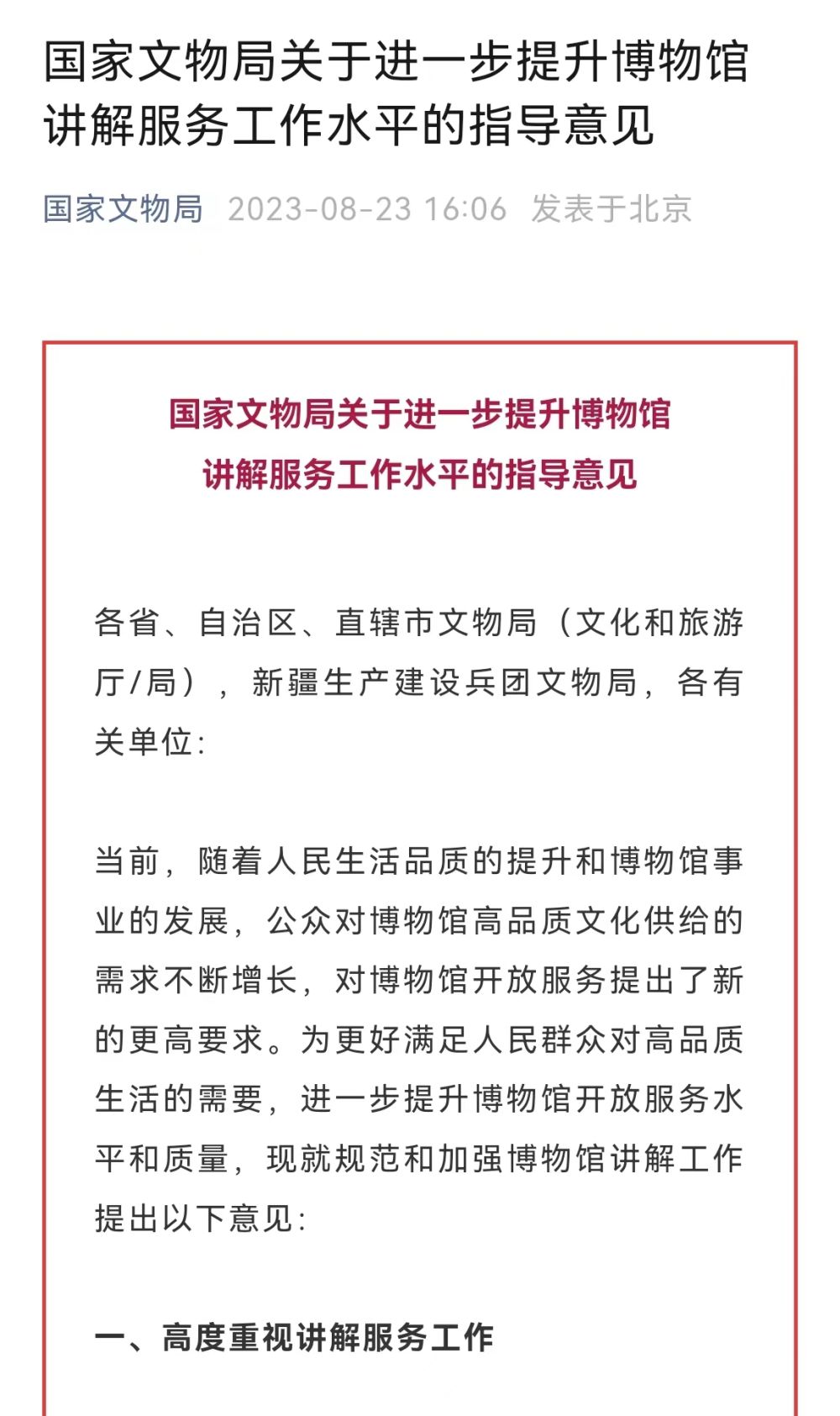 指导意见明确,各级文物行政主管部门应统筹指导所在地区博物馆结合实际情况,适度增加固定时段免费人工讲解频次,定期组织博物馆馆长、相关领域专家学者、科研人员或策展团队开展公益讲解活动,不断增加优质讲解服务供给。