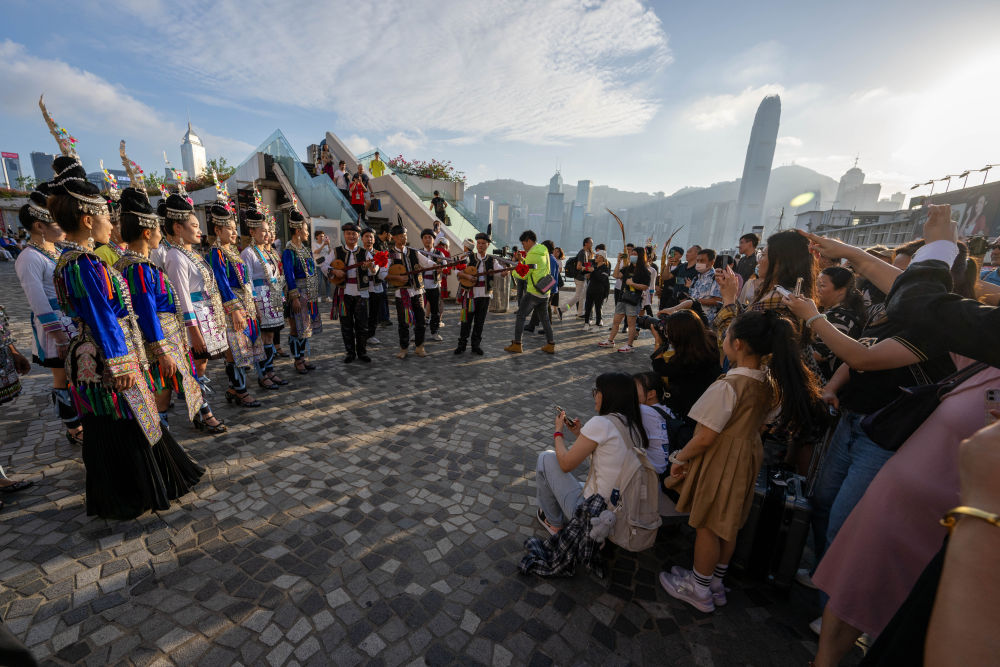 抵达香港后,“村超”啦啦队的部分成员马不停蹄地来到尖沙咀进行了一次别开生面的民族服饰快闪表演。在蓝天与白云的映衬下,一首动听的侗族琵琶歌《心心相印》在维港岸边回响,立刻成为一道美丽的风景,引得游人纷纷拍照留念。