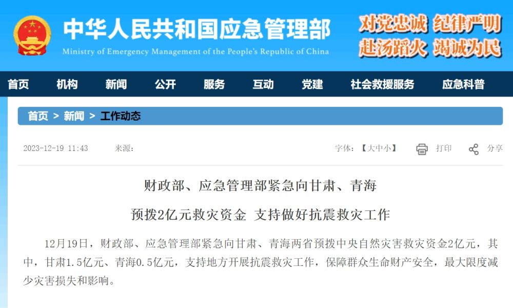 12月19日,财政部、应急管理部紧急向甘肃、青海两省预拨中央自然灾害救灾资金2亿元,其中,甘肃1.5亿元、青海0.5亿元,支持地方开展抗震救灾工作,保障群众生命财产安全,最大限度减少灾害损失和影响。