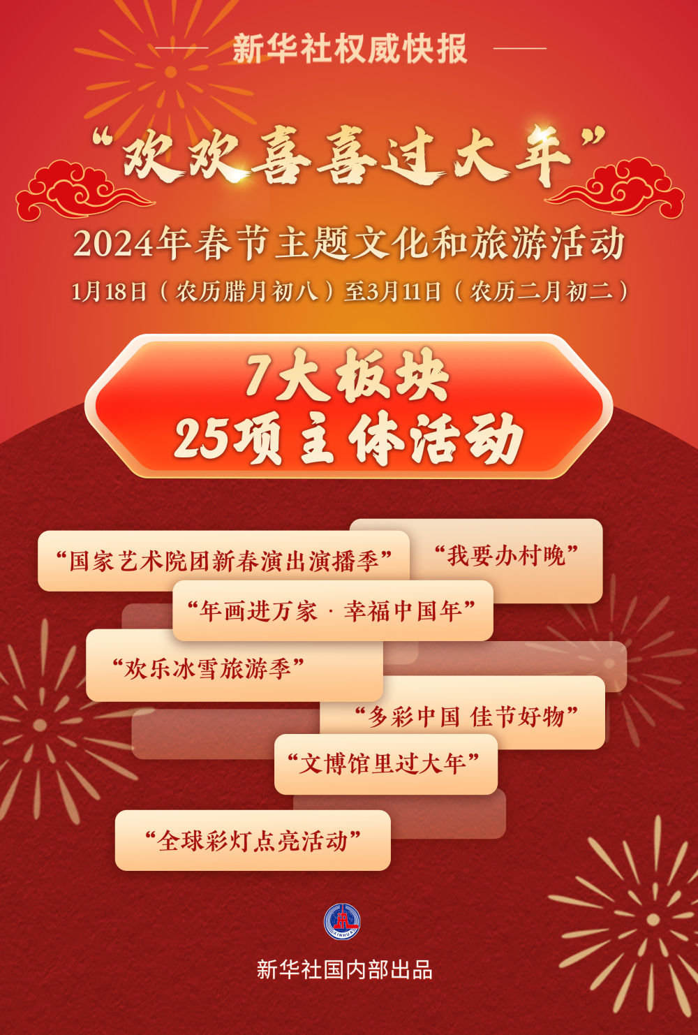 1月18日,文化和旅游部举行媒体推介会,发布“欢欢喜喜过大年”2024年春节主题文化和旅游活动。活动于1月18日(农历腊月初八)至3月11日(农历二月初二)开展,包含7大板块共计25项主体活动。
