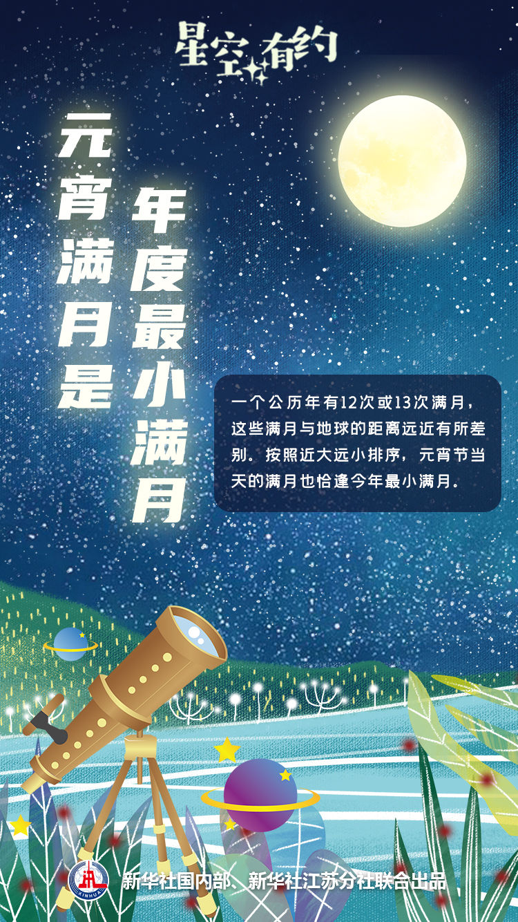 满月可能出现在农历月的十四、十五、十六甚至十七,我国民间早已流传着“十五的月亮十六圆”这句俗语。满月落在正月十五元宵节当天,实为一巧。一个公历年的12次或13次满月,还有远近之别。今年元宵节当天的月球正好位于远地点附近,而且是最接近远地点的一次,因此这个满月也是年度最小满月,较为少见,是巧上加巧。