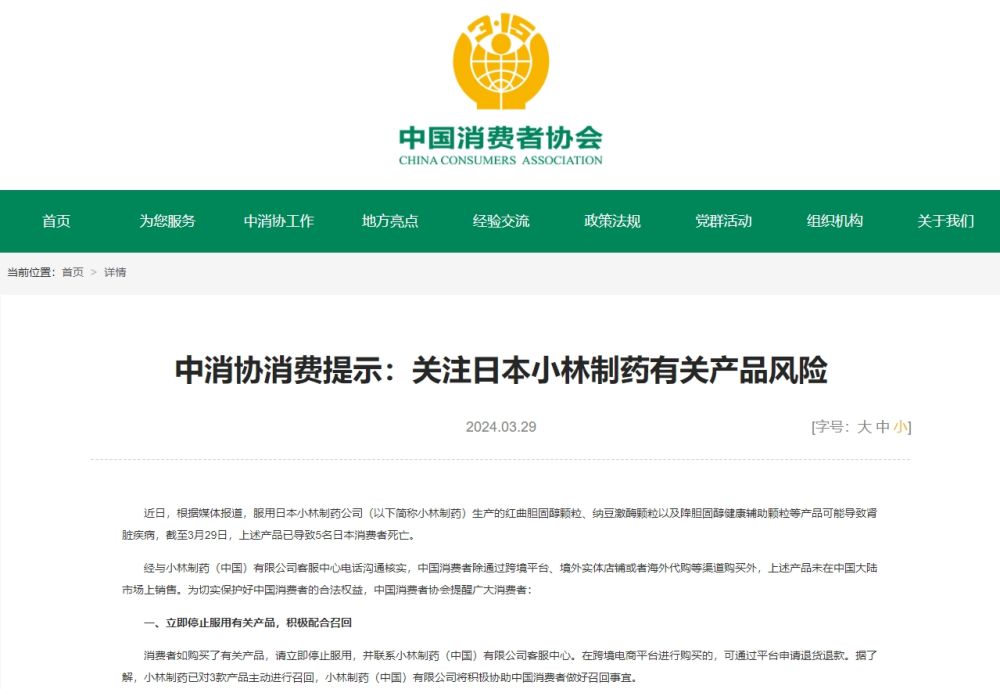 近日,根据媒体报道,服用日本小林制药公司(以下简称小林制药)生产的红曲胆固醇颗粒、纳豆激酶颗粒以及降胆固醇健康辅助颗粒等产品可能导致肾脏疾病,截至3月29日,上述产品已导致5名日本消费者死亡。