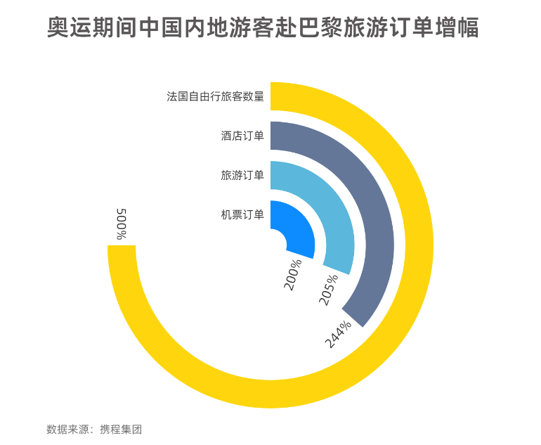 据携程数据显示,中国旅客在奥运期间赴巴黎的订单同比增长105%,机票订单量较去年同期增长1倍,巴黎酒店订单量同比增长122%。巴黎奥运会期间,选择法国自由行的旅客更是较去年同期翻了5倍。同时,法国暑期旅游订单同比增长8成,包车游订单同比增长超5成;德国旅游订单同比增长1.5倍以上。“法国—意大利—瑞士”“荷兰—比利时—卢森堡—德国—法国”等多国游产品成为热门线路。