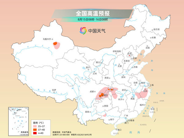 今天,高温范围也较小,主要集中在新疆、四川东部、重庆、湖北西南部、浙江等地部分地区。