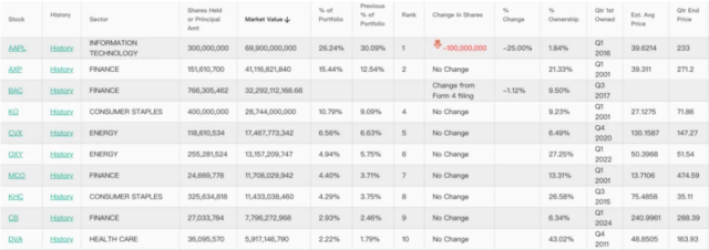 根据持仓数据显示,苹果仍然是其投资组合中的最大重仓股,持有3亿股,市值约为699亿美元,占投资组合的26.24%。尽管苹果继续占据首位,持仓数量却较上季度减少25%,从年初的9.05亿股显著下降至当前的3亿股。